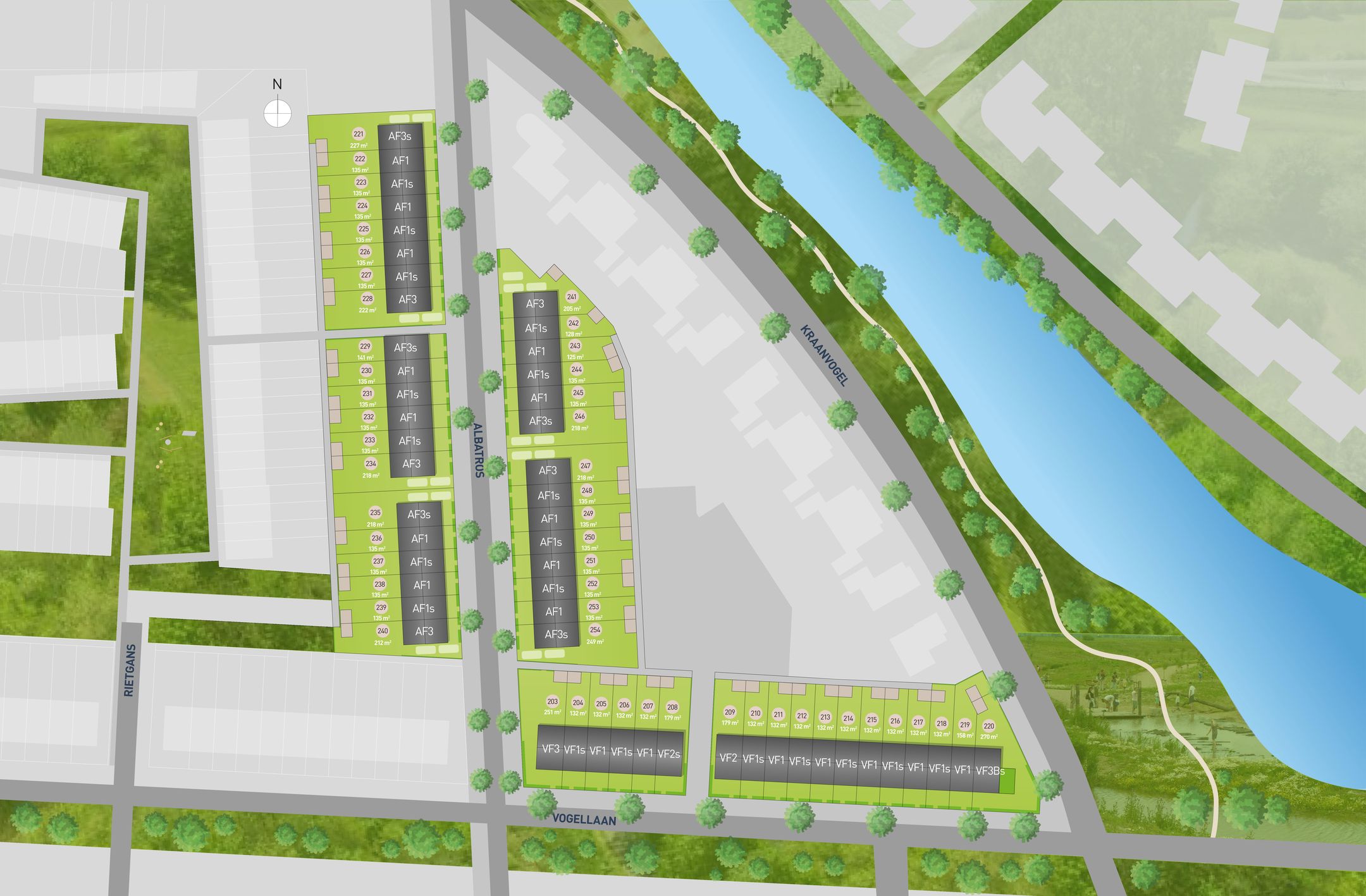 De 10 hoekwoningen van type AF3 & AF3s bieden net dat beetje extra. Gelegen op een hoekkavel aan de Albatros, geniet je hier niet alleen van een ruime woning, maar ook van een flinke lap extra grond rondom je huis. De meest hoekwoningen beschikken over een eigen oprit voor 2 auto's. De extra ramen in de zijgevel zorgen voor extra lichtinval. Welkom thuis De fijne, brede entree geeft je direct een ruimtelijk gevoel. Hier geen trap direct in de hal; die bevindt zich in de living. Je komt binnen in het hart van de woning, tussen de open woon-eetkamer en de keuken. Dit zorgt voor een prettige en open leefruimte waar het licht vrij spel heeft. De keuken is overzichtelijk en slim ingedeeld. Een grote raampartij tot aan de vloer deelt de keuken visueel in tween en laat het daglicht diep de woning binnenstromen. De woonkamer benut de volledige breedte van de woning, wat niet alleen veel mogelijkheden biedt voor de indeling, maar vooral een ruimtelijk gevoel geeft. Ruimte op de eerste verdieping Op de eerste verdieping zijn alle ruimtes bereikbaar vanuit de overloop. De master bedroom beslaat de volledige breedte van de woning en biedt ruimte voor een royale kastenwand. Met een ruimtedeler creer je zelfs een inloopkast! De twee andere slaapkamers hebben voldoende ruimte voor diverse indelingen. Een extra verdieping vol mogelijkheden Wie krijgt de grote slaapkamer op zolder? Of maak je hier een hobby-, speel- of fitnessruimte? De mogelijkheden zijn eindeloos! Daarnaast is er plek voor een wasmachine en eventueel een droger, netjes weggewerkt achter de technische ruimte. Duurzaam en energieneutraal AF3 & AF3s is niet alleen ruim en licht, maar ook energieneutraal. Dankzij energielabel A++++, zonnepanelen, een warmtepomp en slimme warmteterugwinning woon je niet alleen comfortabel, maar houd je ook je maandlasten laag. Wil je meer weten over woningtype AF3 & AF3s? Neem contact met ons op en ontdek of deze hoekwoning bij jou past!