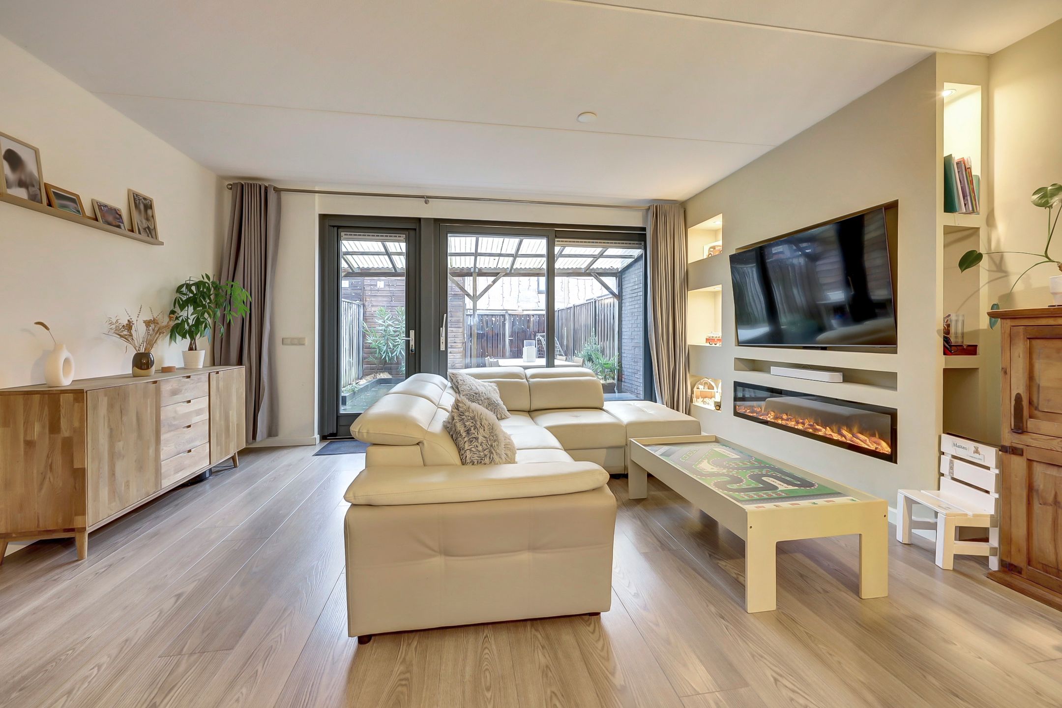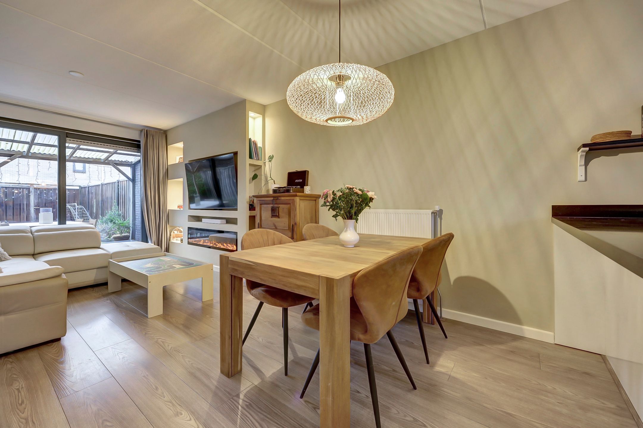 MODERNE TUSSENWONING MET VRIJ UITZICHT OVER GROEN DRONTEN WEST Een ideale woning voor starters! Deze moderne woning op een gewilde locatie in woonwijk De Gilden heeft een luxe keuken, woonkamer met cinewall in combinatie met een sfeerhaard n een vrij uitzicht over groen en het speeleiland. Met vier slaapkamers, een zonnige tuin op het westen en twee priv parkeerplaatsen biedt dit huis alles voor comfortabel (gezins)leven. De centrale ligging in Dronten West betekent dat scholen, het winkelcentrum en het gezondheidscentrum allemaal dichtbij zijn. Perfect voor degenen die het gemak van moderne voorzieningen willen combineren met rustig wonen. De gestelde vraagprijs betreft een "bieden vanaf prijs", biedingen vanaf 389.000,- k.k. zullen door verkoper in behandeling genomen worden. INDELING Begane grond Via de entree kom je binnen in de hal met garderobe, meterkast afgewerkt met houtpanelen, toiletruimte en de deur naar de woonkamer. De straatgerichte luxe keuken is voorzien van een Boretti gasfornuis met designafzuigkap, vaatwasser en koelkast. De keuken is in een U-vorm opgesteld waardoor je tijdens het koken contact houdt met de woonkamer. De tuingerichte woonkamer biedt een heerlijke leefruimte voorzien van een moderne cinewall met sfeerhaard. In de woonkamer bevindt zich tevens de -door een deur afgesloten- trap naar de eerste verdieping. De schuifpui en aparte loopdeur zorgen voor veel lichtinval en geven toegang tot het terras met aangebouwde overkapping en de zonnige onderhoudsarme tuin. Middels een brede poort zijn vanuit de tuin de carport en twee parkeerplaatsen bereikbaar. De begane grond vloer is voorzien van laminaat. 1e verdieping Via een vaste trap bereik je de eerste verdieping met drie slaapkamers en een moderne badkamer. De slaapkamers zijn praktisch en ruim ingedeeld en zijn voorzien van draai-kiepramen met horren en elektrische rolluiken. De moderne badkamer is volledig ingericht bestaande uit een ruime inloopdouche, ligbad, 2e toilet, wastafelmeubel en designradiator. De overloop en slaapkamers zijn allen voorzien van een lichte laminaatvloer. Zolderverdieping De ruime zolderverdieping beschikt over een praktische voorzolder met dakkapel waar de wasmachine, cv-ketel en mechanische ventilatie-unit staan opgesteld. Hier bevindt zich ook de vierde slaapkamer met dakraam. Achter de knieschotten is bergruimte aanwezig. Bijzonderheden Moderne tussenwoning uit 2011 met energielabel A+ Luxe keuken met Boretti apparatuur Woonkamer met cinewall sfeerhaard en schuifpui naar tuin Vier slaapkamers verdeeld over twee verdiepingen Zonnige tuin met aangebouwde overkapping Vrij uitzicht over groen en speeleiland Twee priv parkeerplaatsen met carport Alle vloeren voorzien van laminaat Dakkapel op zolderverdieping met wasruimte 7 zonnepanelen Leuke buurt nabij scholen, winkelcentrum en gezondheidscentrum Aanvaarding medio maart 2026. Deze informatie is door ons met de nodige zorgvuldigheid samengesteld. Onzerzijds wordt echter geen enkele aansprakelijkheid aanvaard voor enige onvolledigheid, onjuistheid of anderszins, dan wel de gevolgen daarvan. Alle opgegeven maten en oppervlakten zijn indicatief.